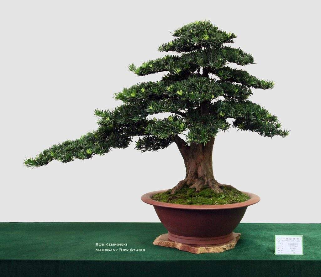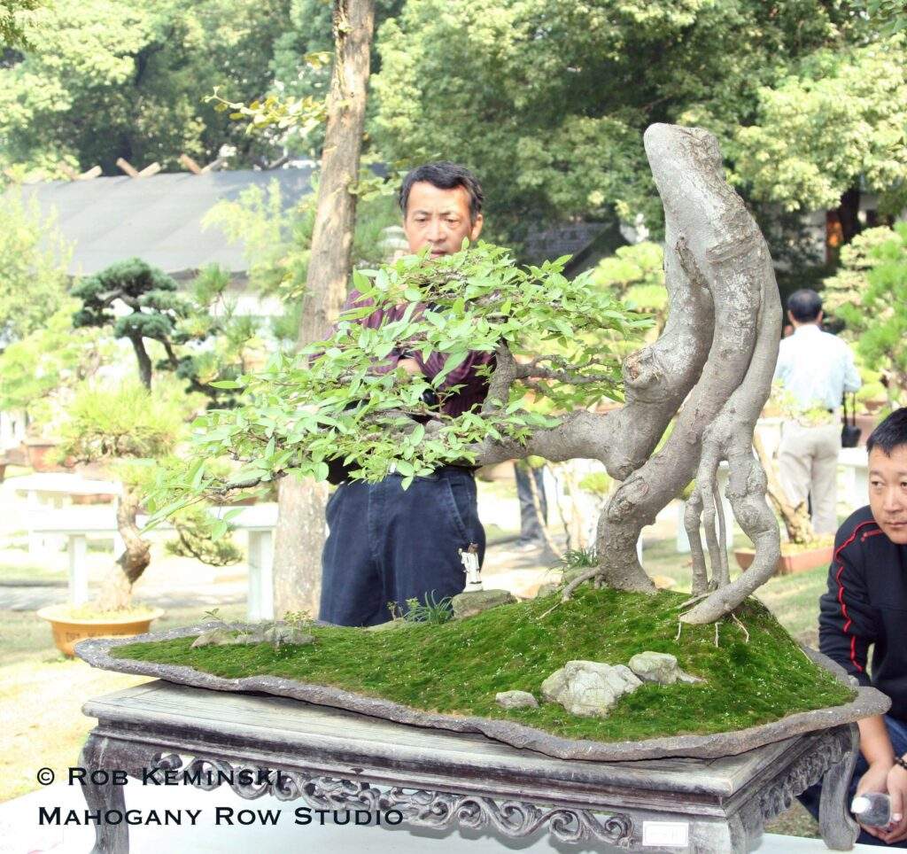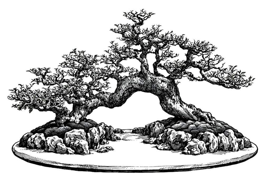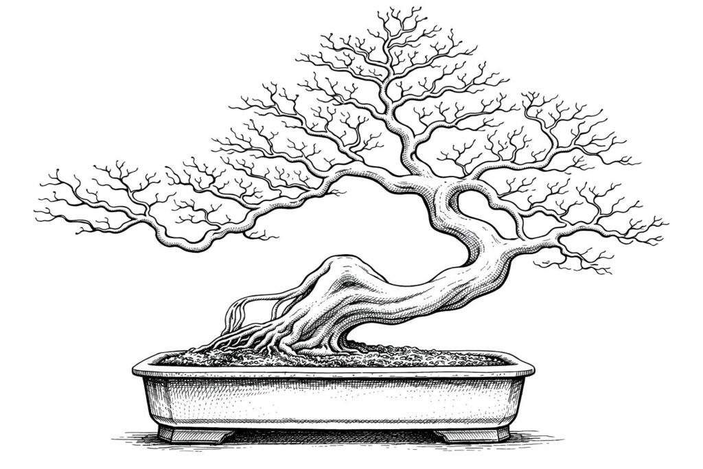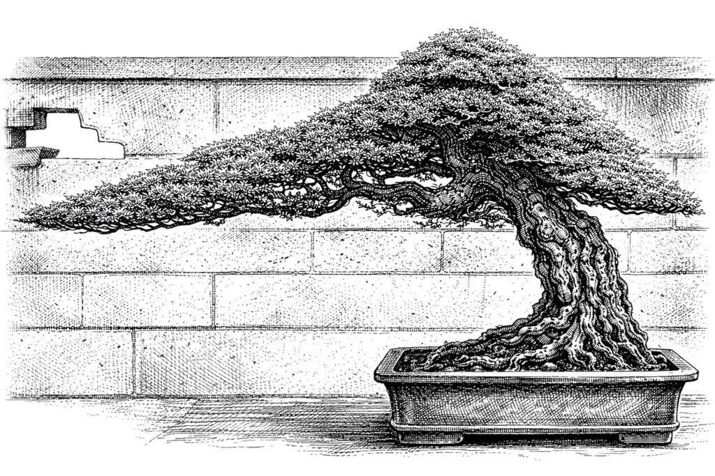 The Swan Style – In Chinese penjing, particularly within the Lingnan school of southern China, the swan style is referred to as tiān’é shì (天鹅式), which translates directly to “swan style” or “swan shape.” This design is characterized by a long, elegant, curved trunk that mimics the neck and body of a swan. The root mass—or the portion of trunk lying along the ground—can represent the body, while the curved trunk forms the graceful neck. This style might feature a “pigeon breast” curve, something usually avoided by bonsai artists but encouraged in this particular interpretation.