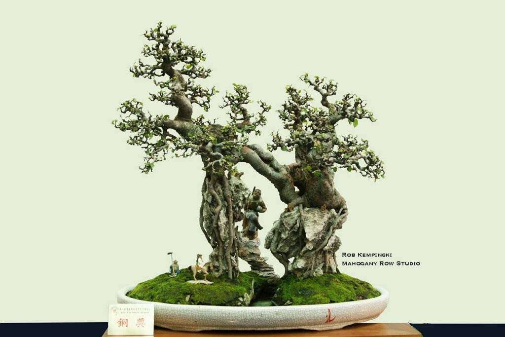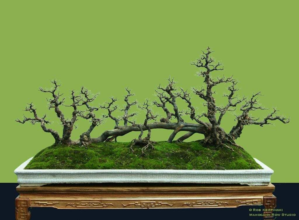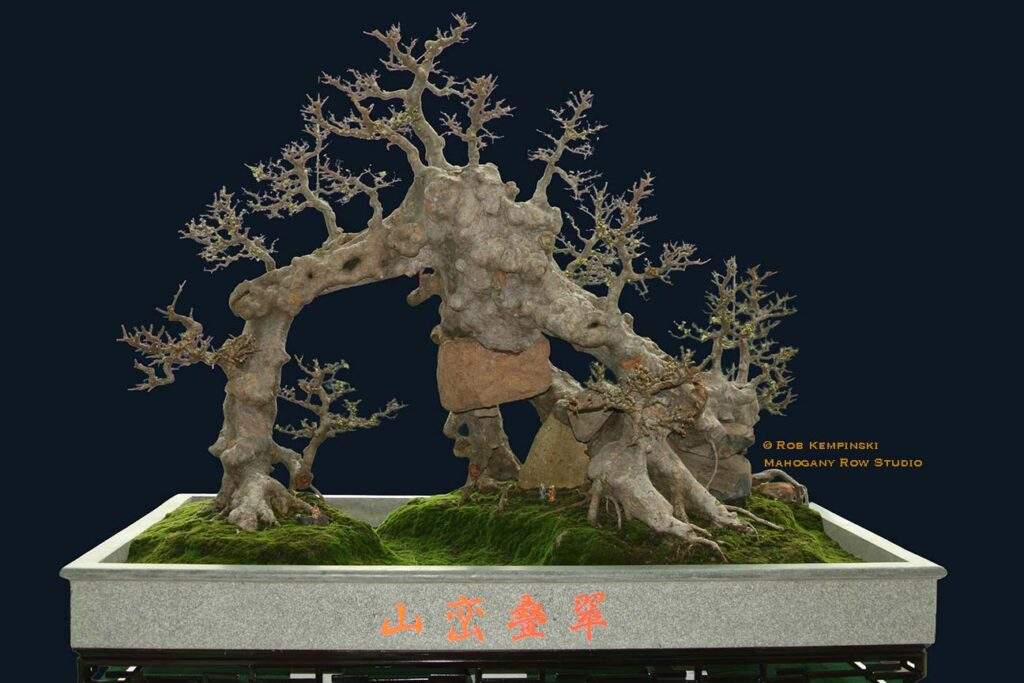 The Bridge Style – This configuration could be thought of as a subset of the raft or root-connected style. What differentiates the bridge is that a portion of the trunk lying on the ground is raised enough to create an air gap beneath it. I find this style very appealing—perhaps because I was a combat bridge builder when I served in the U.S. Army. This design could appear anywhere but seems more common in China, where it is called Qiao-xing (桥型). It falls under the broader category of Shanshui Penjing (山水盆景 – mountain and water) or Shuihan Penjing (水旱盆景 – water and land), emphasizing naturalistic and dramatic landscapes. It can also be presented as a stand-alone tree without a landscape setting. The foliage configuration may have trunks or branches that appear like separate trees, or it may present as one unified tree.