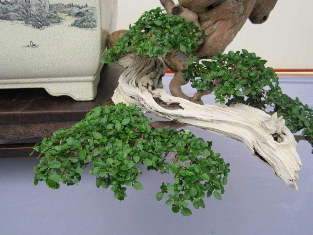Growth and Maintenance – S-30 to S-90: Plan for the time needed to give each tree appropriate care and maintenance leading up to this final period of preparation, including trimming, defoliation, trunk cleaning, and protection from pests. I like to clean the branches and trunk of my display trees about a month before the event, followed by a light re-cleaning the week of the show. I prefer to show trees without wire, which can only happen with a tree in Phase 4 of the design art cycle. If you must use wire, make it fine wire and avoid crossing the main trunks. Never use guy wire on a tree in a show, as it clearly indicates that the tree is not in Phase 4 and is considered an unsightly shaping technique. The use of lime sulfur on deadwood is another personal preference; if your design requires white deadwood, apply the lime sulfur at least 30 days before the show so it can dry and whiten properly.